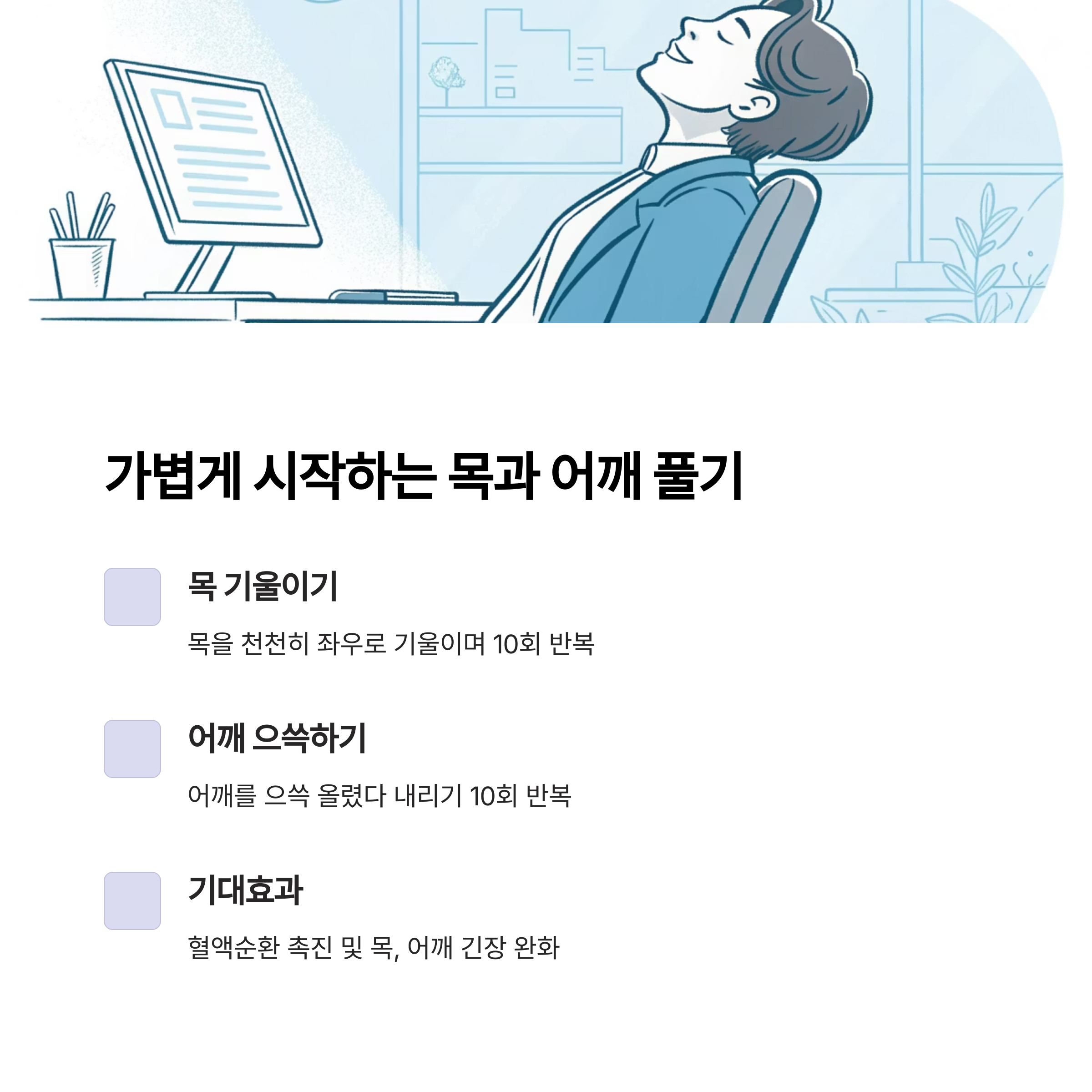 "가벼운 목 돌리기와 어깨 으쓱이기부터 시작해 보세요."
