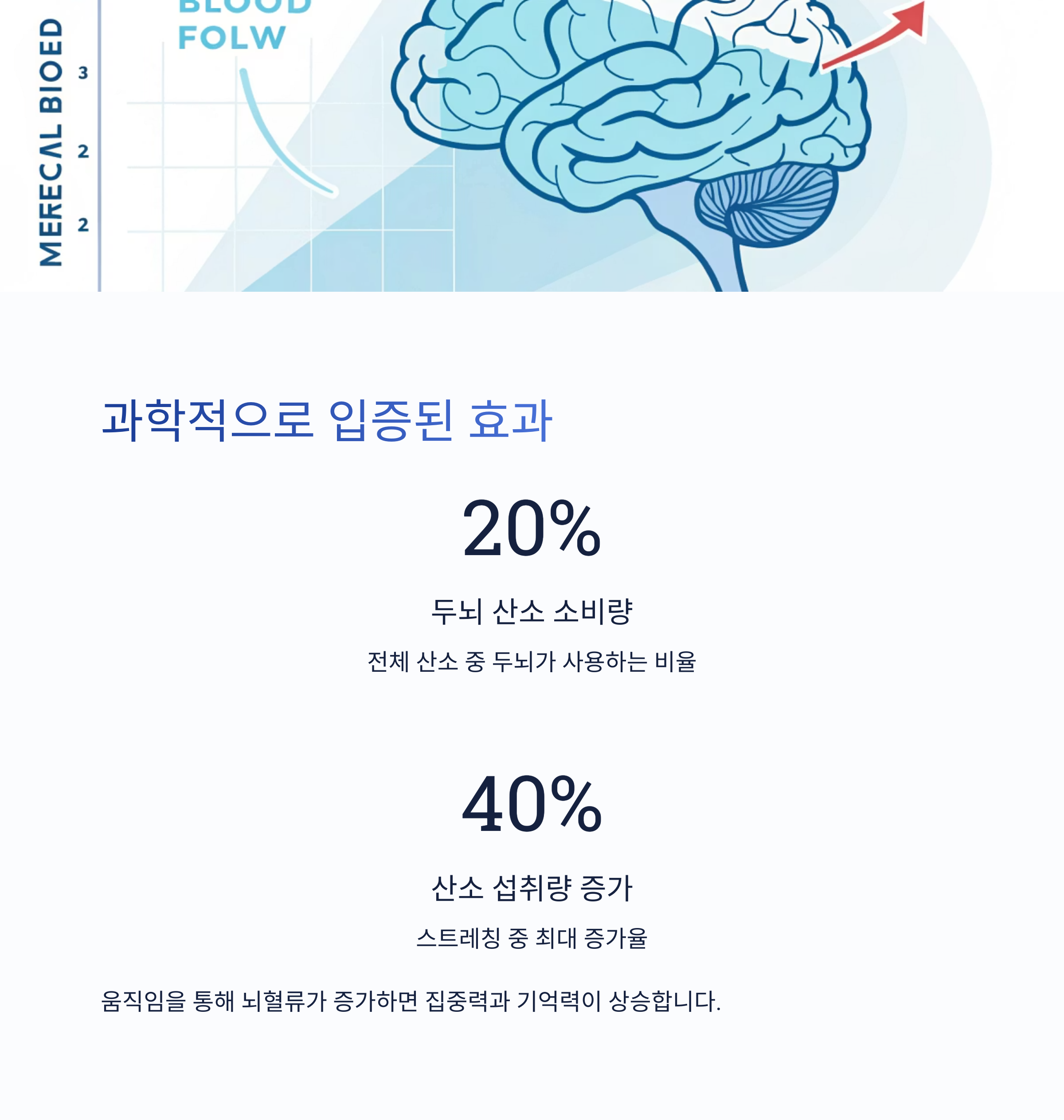- 움직임을 통해 뇌혈류가 증가하면, 집중력과 기억력이 상승